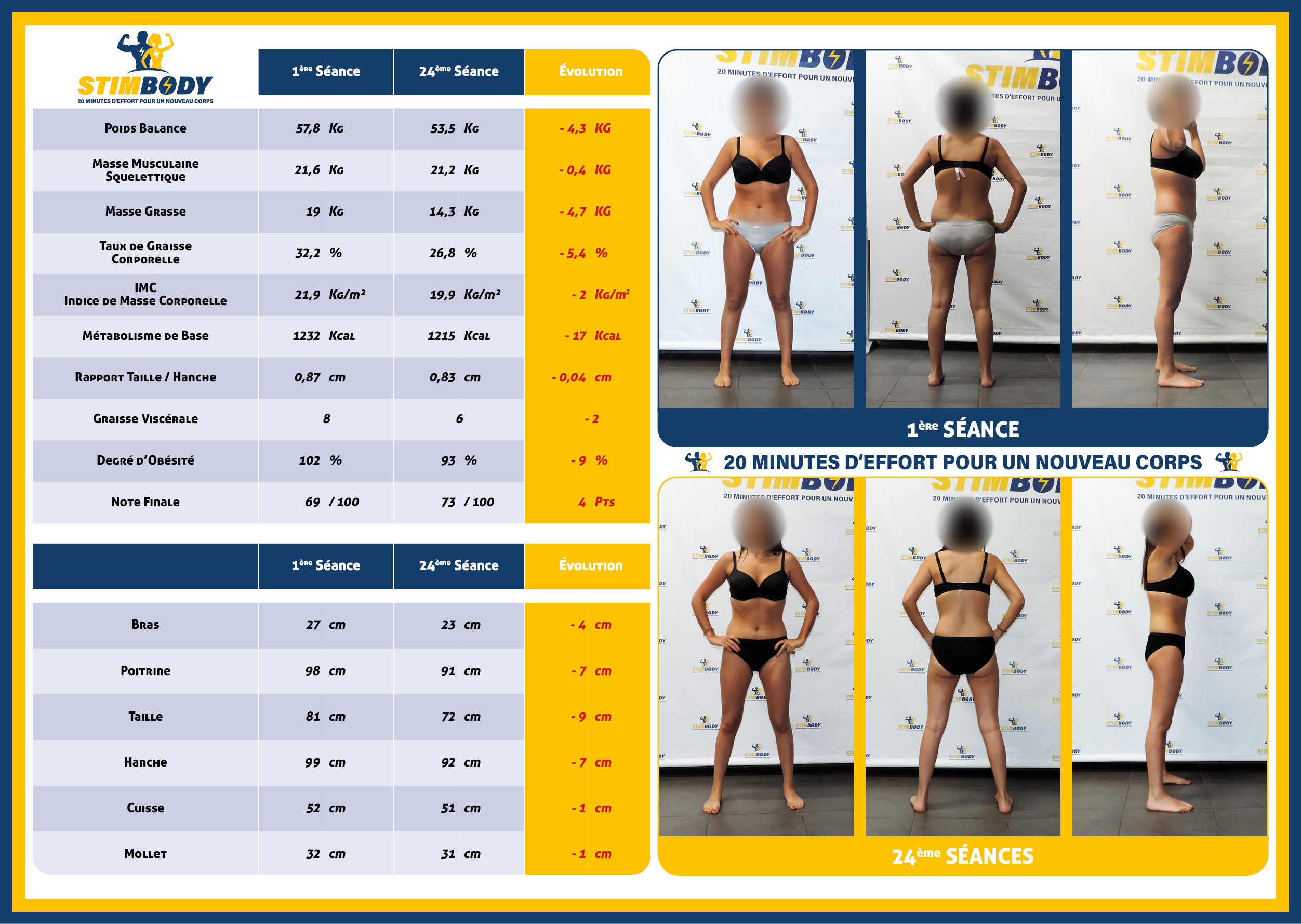 Bien qu’il n’y ait aucun besoin de maigrir, une perte de poids a été mesurée (-4,3kg). Sa graisse viscérale est passée de 8 à 6. Les mensurations témoignent des efforts fournis pendant les séances : -7cm de tour de poitrine, -9cm de tour de taille, -7cm de tour de hanche et -1cm de tour de cuisse.
