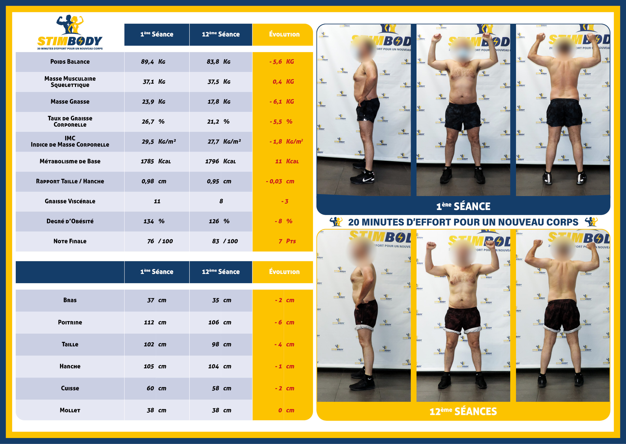 En 12 séances, une perte de poids de 5,6 kg a été enregistrée sur la balance, plus précisément 6,1 kg de graisse ! Une nette baisse du taux de graisse corporelle de 5,5 %.